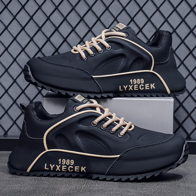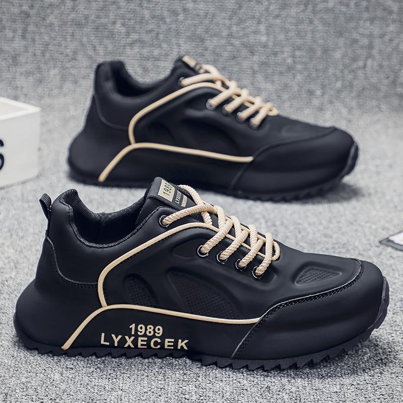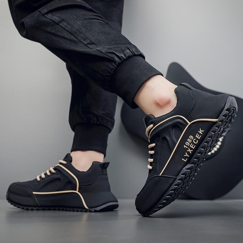 [Breathable Comfort] Men'S Retro Style Sneakers - All-Match Black Casual Sports Shoes with Beige Accents, Durable Rubber Sole, Breathable PU Upper, Lace-Up Design for Everyday & Training Running Closed