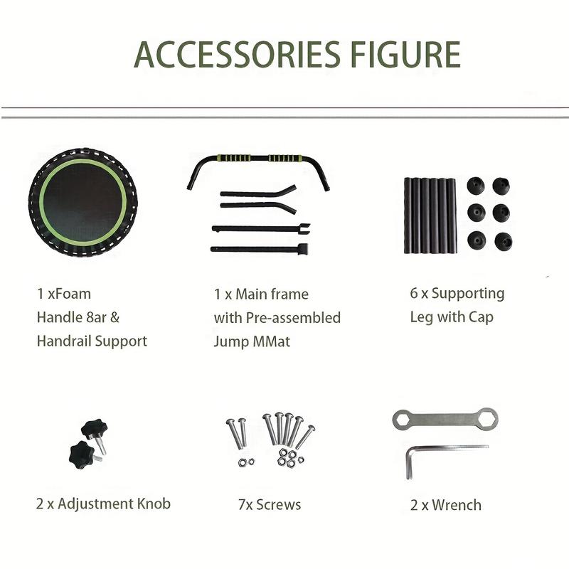 - 5-level Adjustable Handle: The fitness trampoline equipment with a 5-level height (on the mat), Jump with confidence
